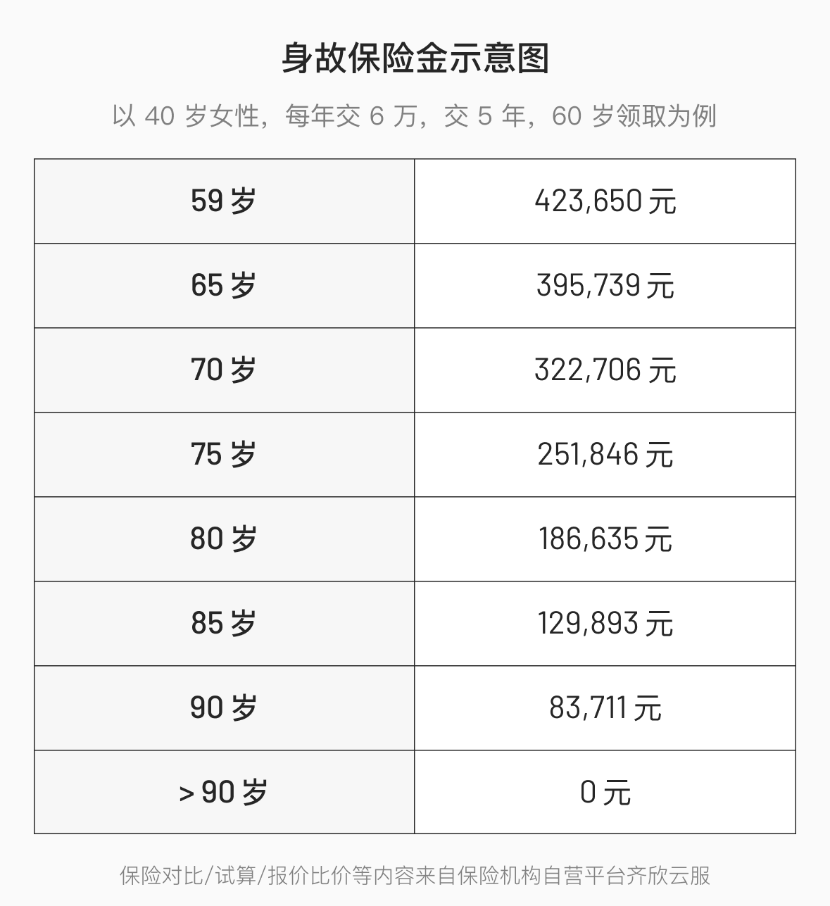 还是以王姐为例,每年交 6 万,交 5 年,选择 60 岁领取,不同年龄身故的领取金额如下,对比了同样条件下带保证领取责任的主流产品,发现还是龙抬头 3.0 赔付的金额多。