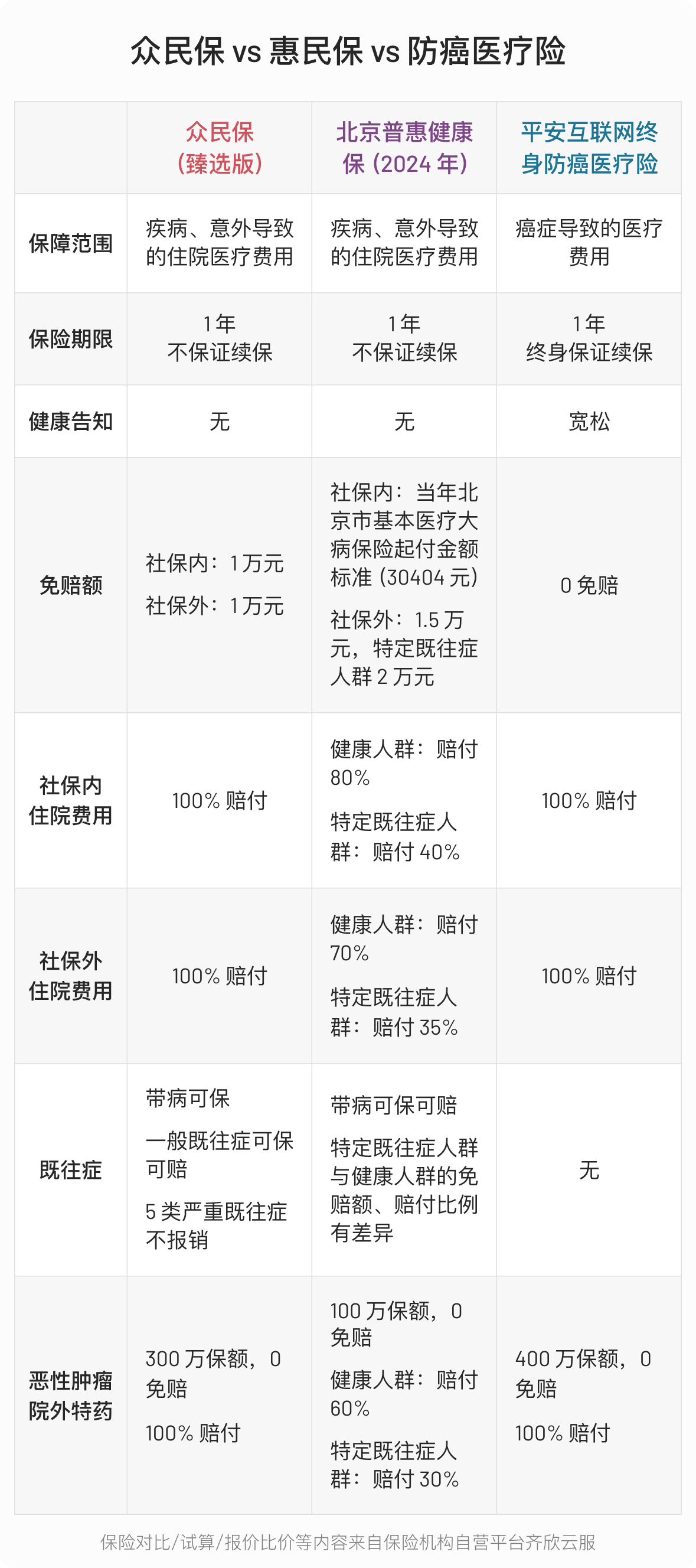 其中,众民保选的是保障更为全面的臻选版,惠民保则以我所在城市——北京的普惠健康保(2024)为例,防癌险选的是主推产品平安互联网终身防癌。