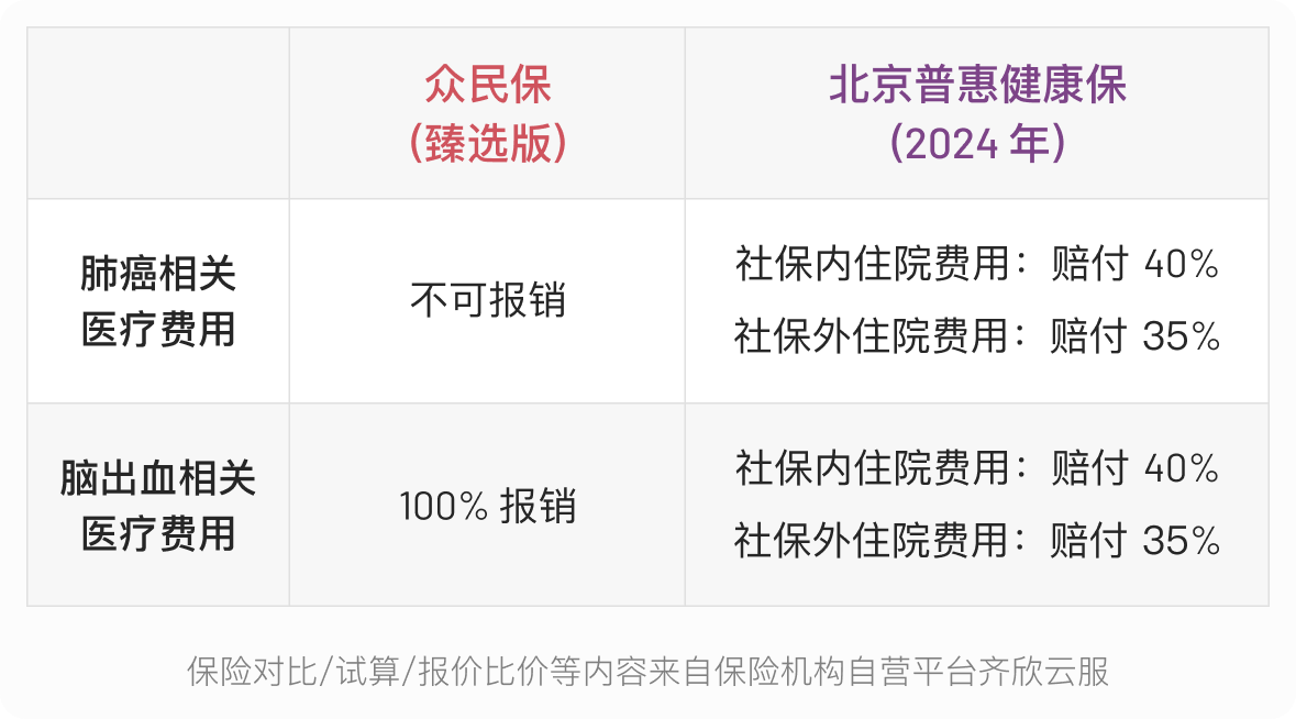 所以,也未必要在两者中二选一,如果预算允许,可以投保一份众民保臻选版,再同时配置一份北京普惠健康保。
