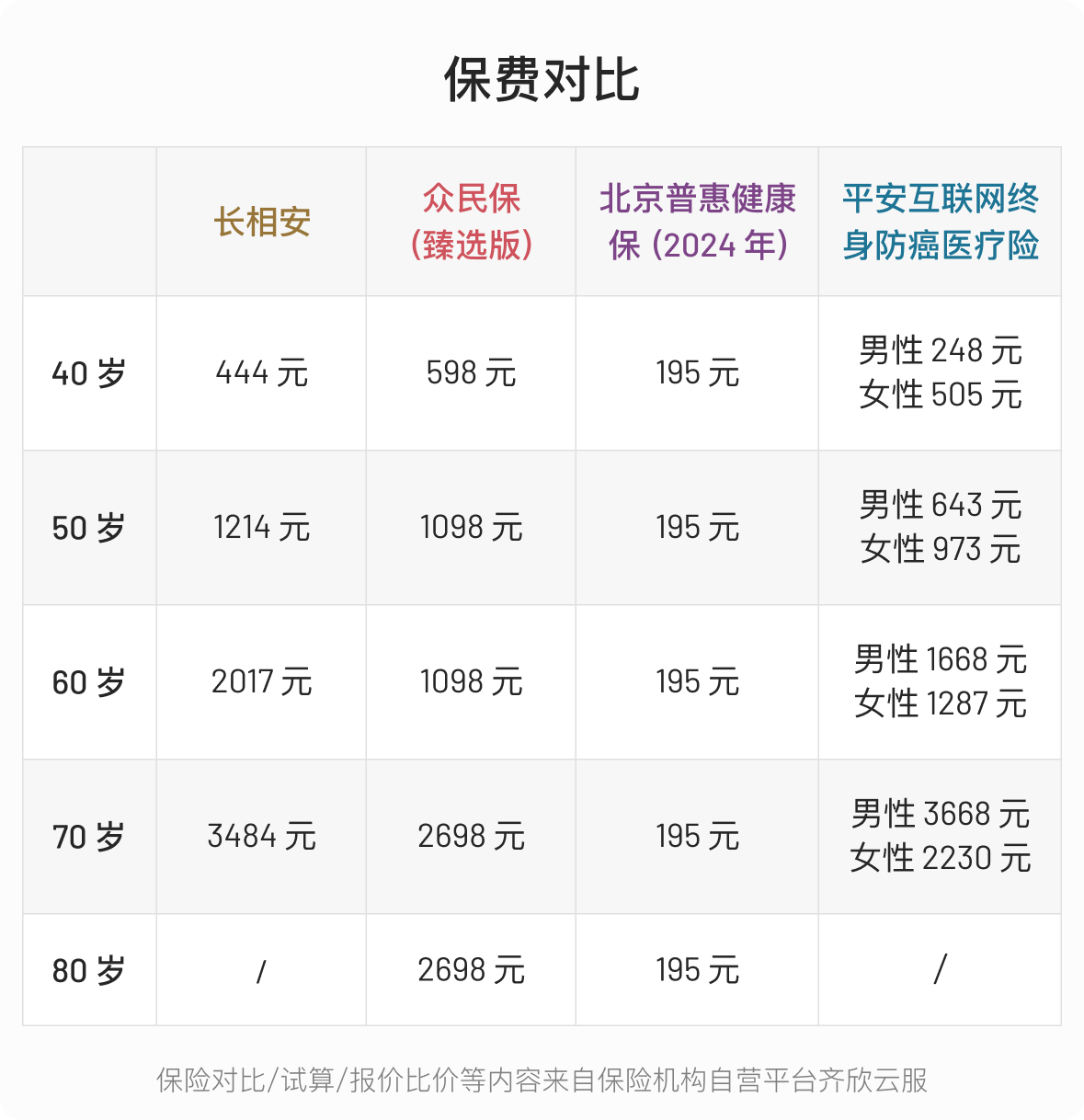 它比传统百万医疗险便宜一点。跟防癌医疗险差不多,年纪较轻时,防癌险医疗险较便宜,年纪长了,众民保的价格则更低。