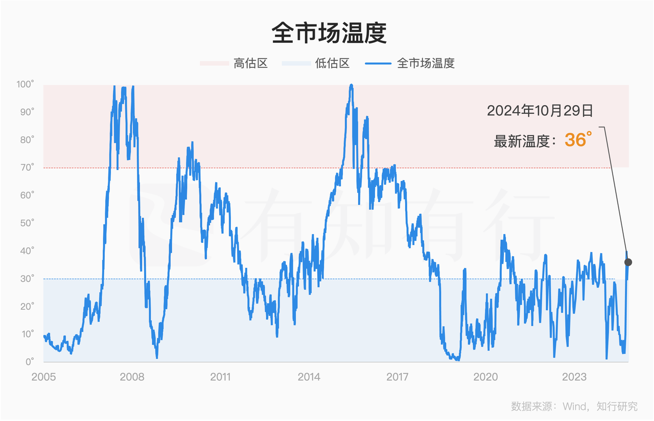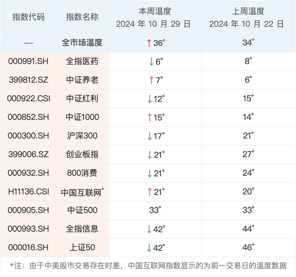 先来看看最近一周的股市情况。是不是相比于之前,平稳了很多?最近一周每天慢慢上涨,虽然这周二出现了一个明显回调,但整体来说,过去一周大部分A股是上涨的。中证全指上涨 0.75%。受此影响,最新的全市场温度提高到了 36°。