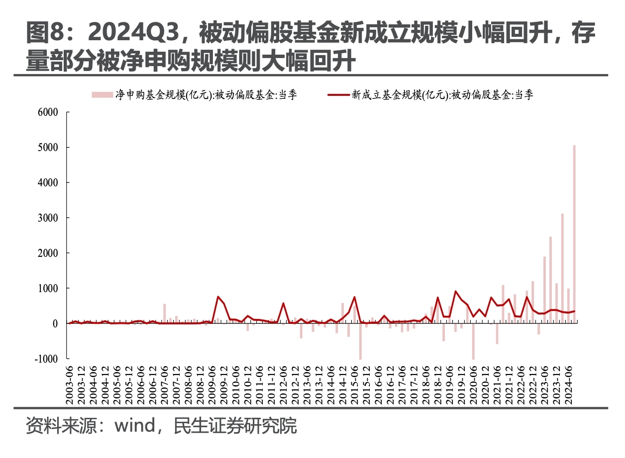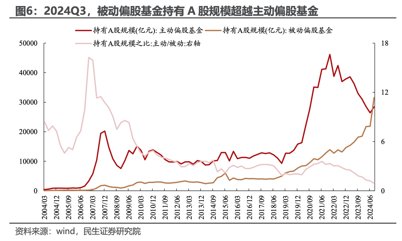 上面这张图是民生证券统计的从 2004 年一季度一直到 2024 年三季度,主动偏股基金、被动偏股基金持有的A股规模的变化情况,以及二者的相对关系的变化情况。