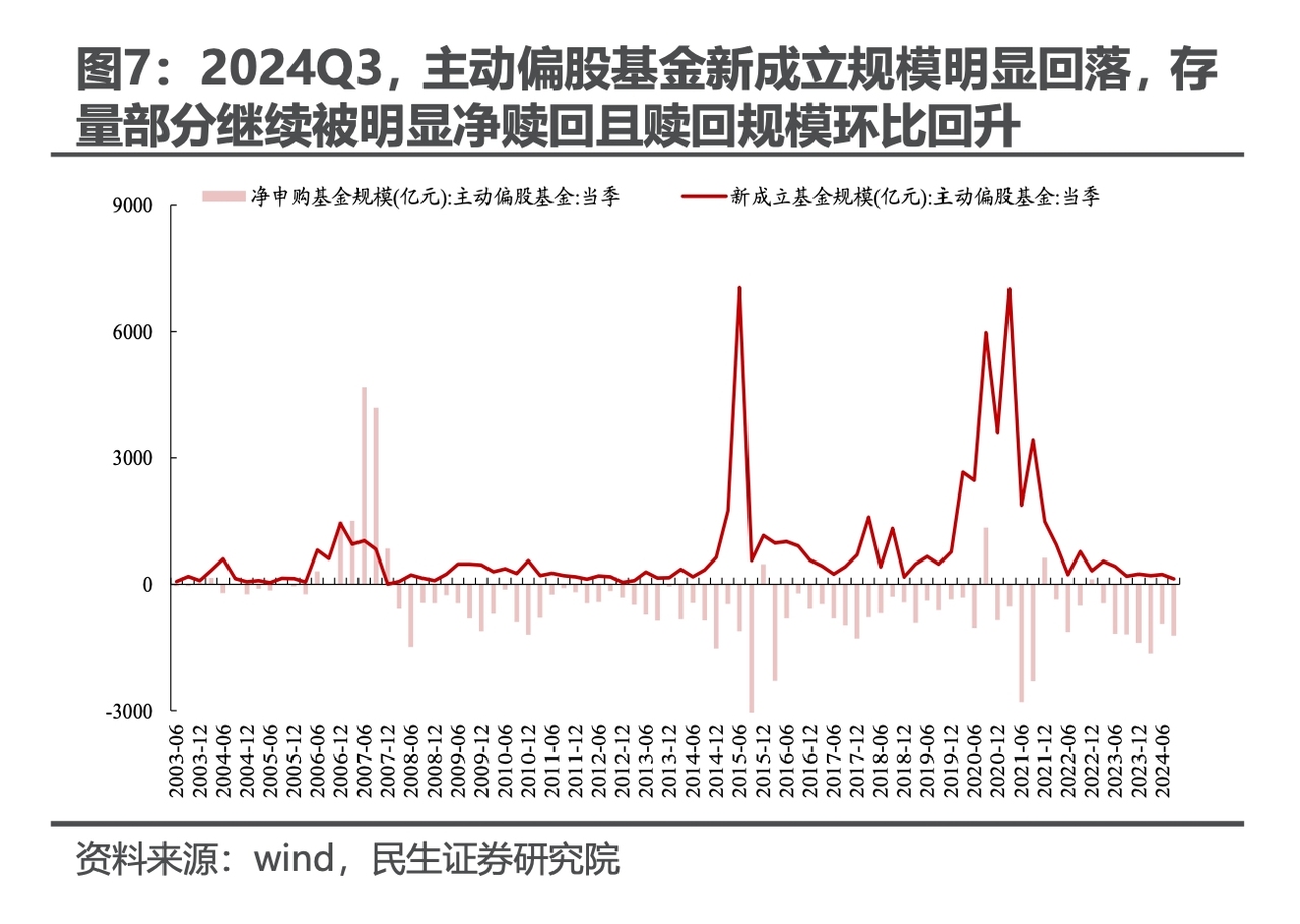 我们能观察到,每一次小幅的市场反弹,都会引发主动偏股基金的赎回潮,今年九月底这次反弹也是一样的。下面这张图展示了每个季度主动偏股基金新成立基金的情况,以及净申购净赎回的情况。可以看出来,从 2021 年高位以来,主动偏股基金的新发基金规模不断创出新低,新基金很难卖出去。而存量基金的情况是,这两年净赎回现象严重,赎回规模远远高于申购规模。今年三季度末相比于二季度末,净赎回规模还出现了回升。抛弃主动偏股基金,远离主动偏股基金,成为这两年基民的主要选择之一。