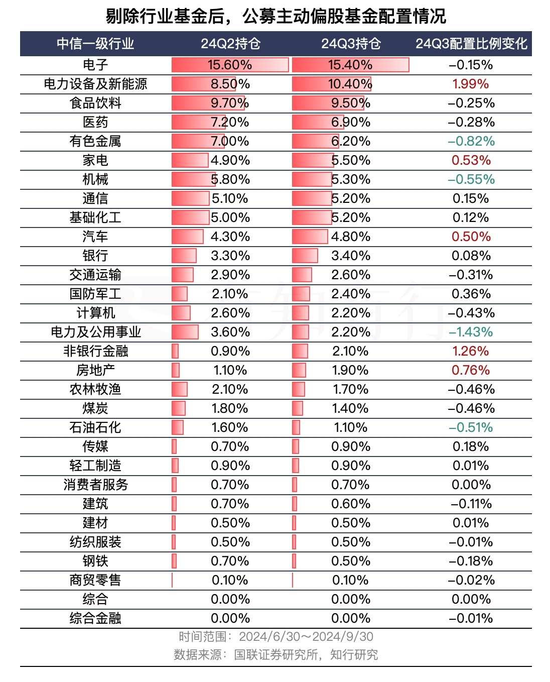 从上图来看,截止到三季度末,主动偏股基金重仓的行业分别是电子、电力设备及新能源、食品饮料、医药等。相比于二季度末,主要加仓了电力设备及新能源、非银金融、房地产、家电、汽车等行业,主要减仓了电力及公用事业、有色金属、机械、石油石化等行业。从主动偏股基金重仓的行业能看出来,基金经理们整体仍旧偏好成长风格明显的行业。