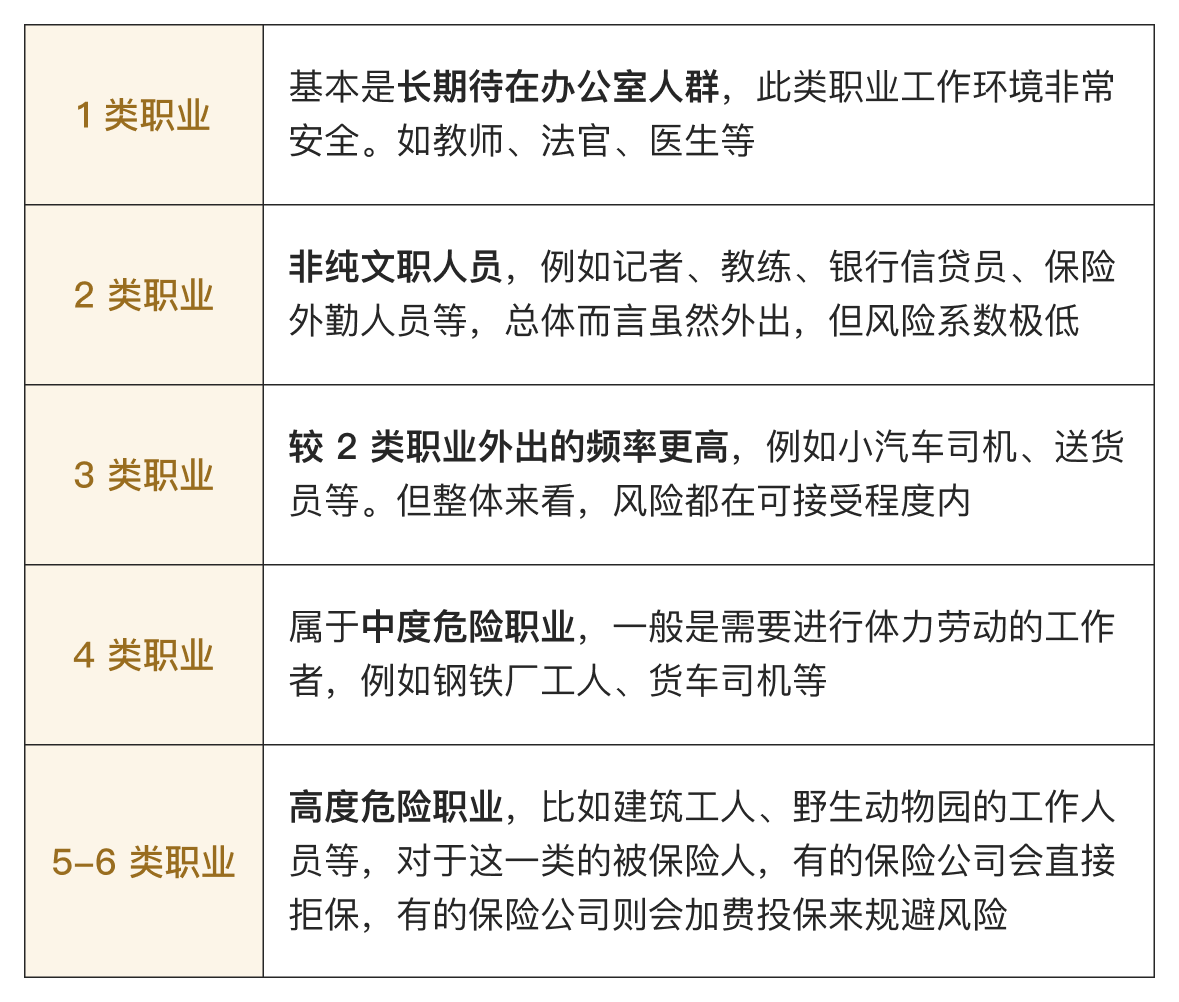 职业也对意外险影响很大。比如办公室职员的意外风险显著低于警察、建筑工人或驯兽师等高危职业。保险公司根据意外风险,将职业分为1-6类:
