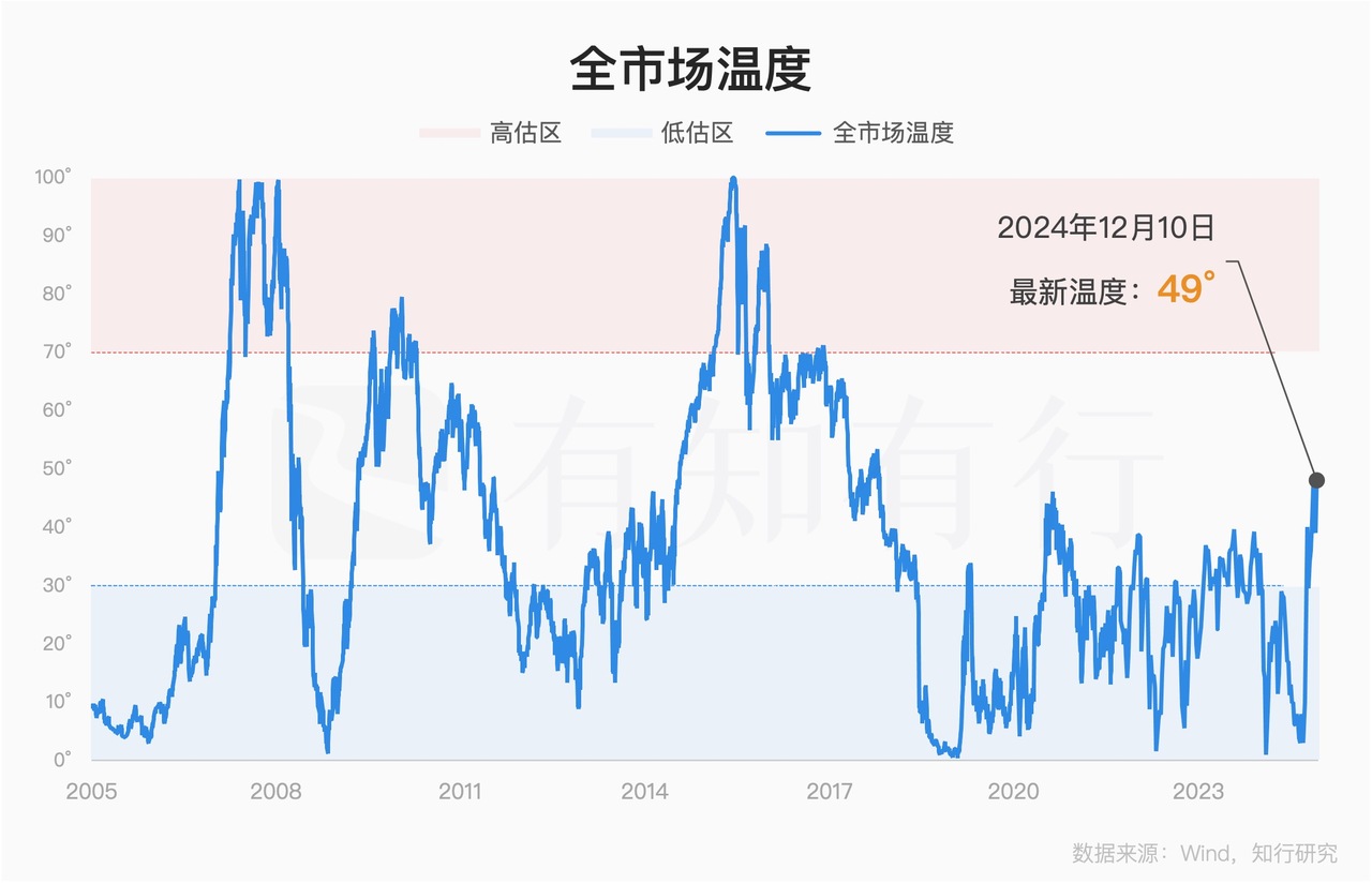 有个问题想问一下有知有行,现在温度计温度已经超过21年高点了,是否意味着整体市场的估值点位已经到近几年的高点了,如果未来经济回暖企业盈利增长,是否意味着股市可能会出现越涨越便宜,因为从指数来看的话成长的创业与沪深300,都处于较低位置……光看目前的市场估值总有种很矛盾的感觉,明明相比较以前来说并没涨多少,但是估值却肉眼可见的变贵了……