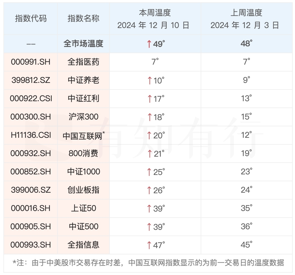 先来看看市场情况,最近一周,A股、港股整体上涨,港股表现更好。中证全指上涨 1.15%,恒生指数上涨 2.86%,恒生科技涨幅更大一些,上涨 3.94%。由于股市整体上涨,我们的全市场温度来到了 49°。