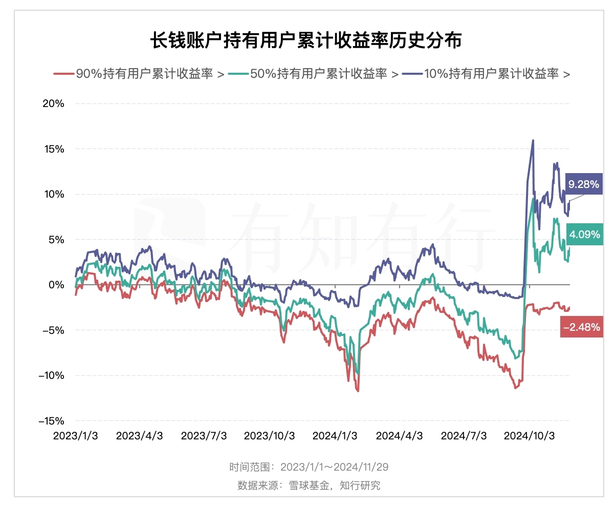 接下来,我们来聊聊长钱账户持有用户的累计收益率分布情况。近期,雪球基金开始展示长钱账户持有用户累计收益率历史分布数据,每月更新一次,最新更新日期是 2024 年 11 月 29 日。