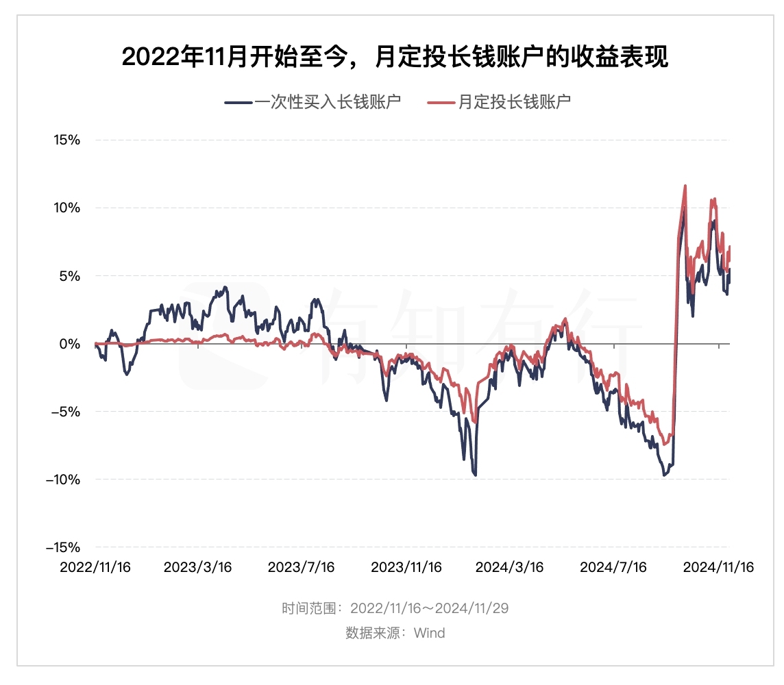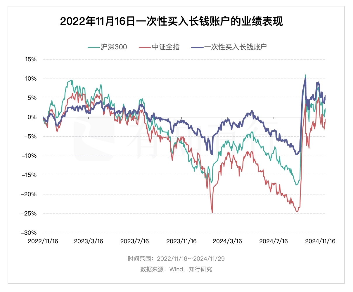 首先是如果在 2022 年 11 月 16 日一笔买入后,之后再也没有投入过,一直持有到今年 11 月 29 日的话,累计收益率在 5.5% 左右。