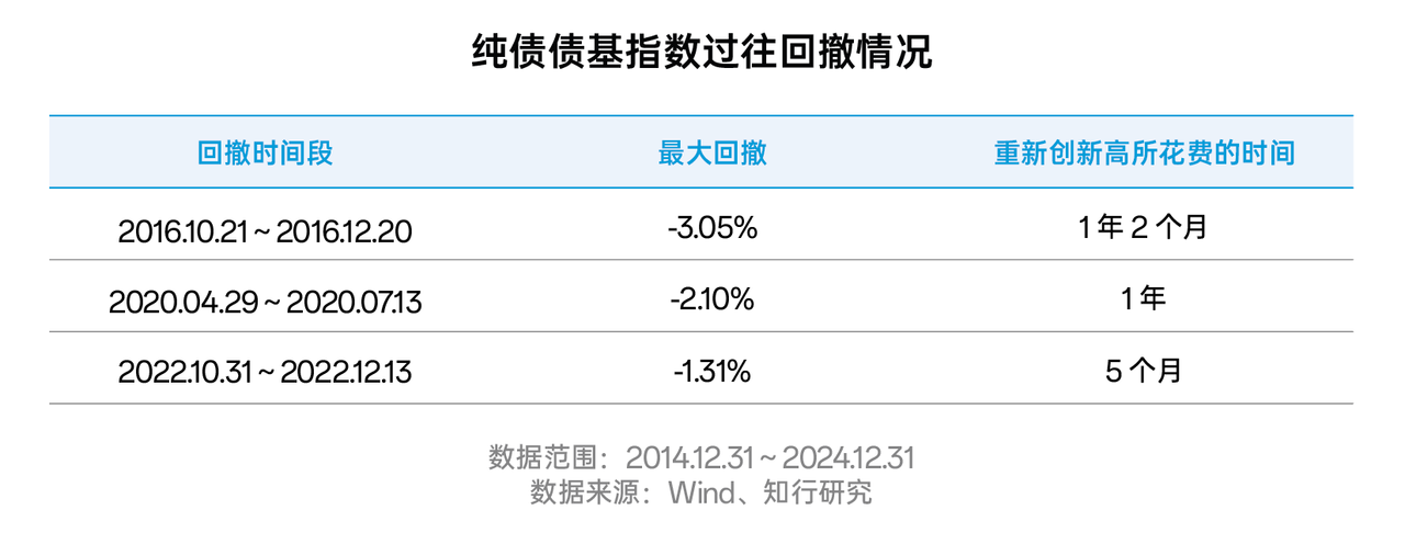 比如,2016 年、2020 年、2022 年纯债债基指数都出现过明显下跌,其中,2016 年和 2020 年的两次回撤中都用了接近一年的时间重新回本,创出新高。如果你投资的是久期更长的债券基金,那么波动会更大。