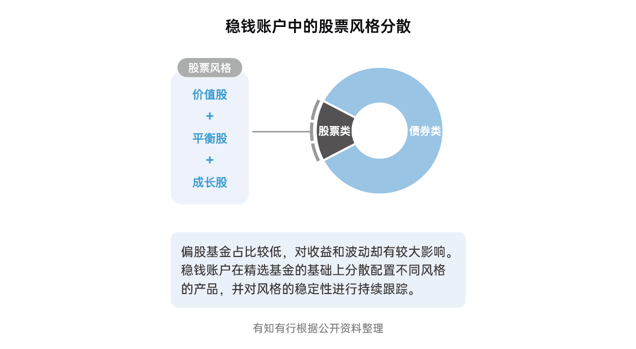 稳钱账户的这种金字塔资产配置结构决定了它的收益和风险介于股票和债券资产之间。