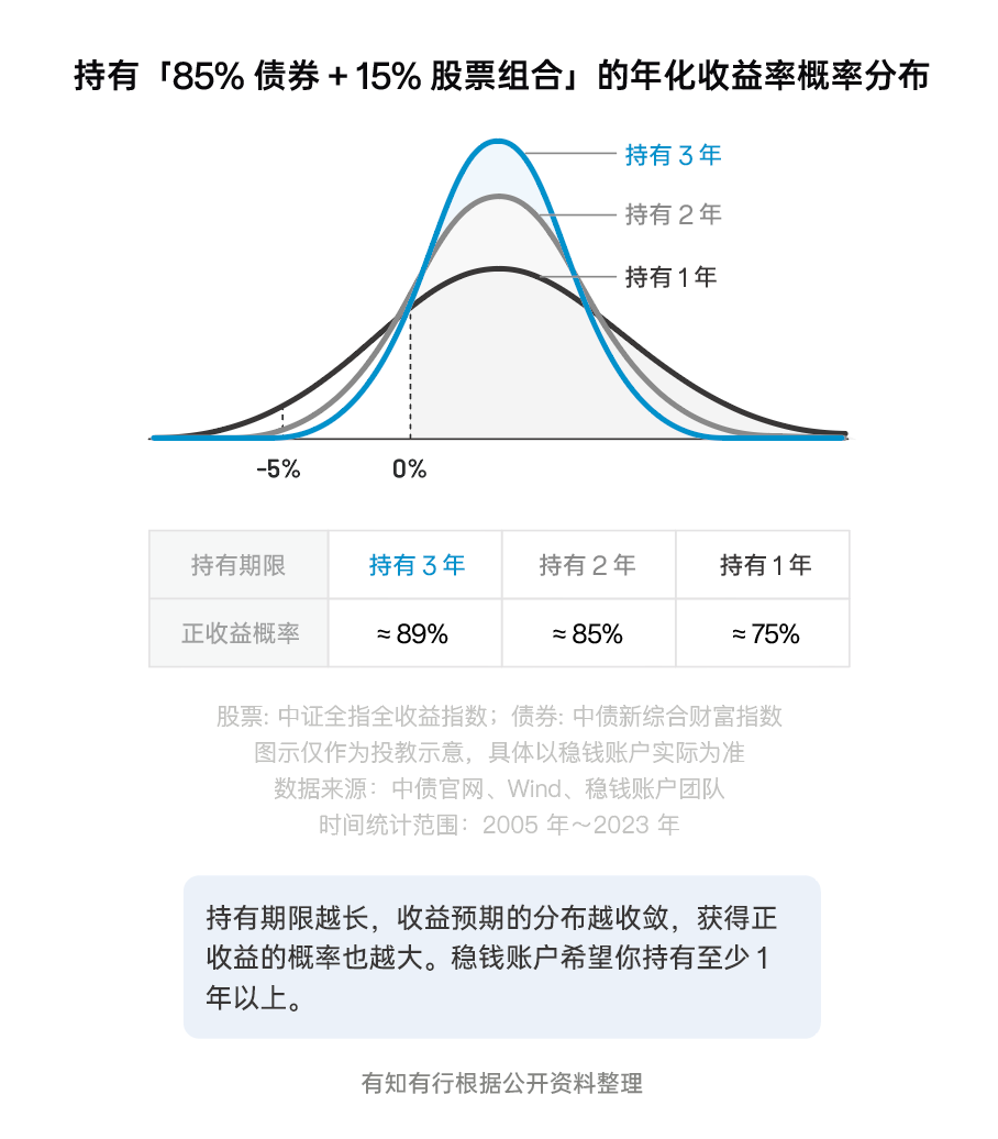 我们按照持有债券 85% + 股票 15% 组合的年化收益率概率进行回测,可以看到,持有一年时,稳钱账户实现正收益的概率约为 76%,意味着亏损的可能性依然有 20% 或以上。因此,建议投资者持有至少 1 年以上。持有时间越长,获得正收益的概率越大,亏损概率越小。