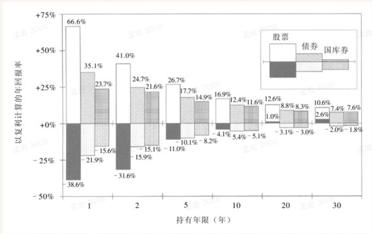 不过更有意思的是,当时间拉长到十年以上这个区间,持有股票的最差收益率,已经开始比持有债券和国债更高了。到了二十年以上,你可以获得的最差收益率也是正的。也就是说,在这个时间尺度上,只要持有不动,你毫无亏钱的可能。