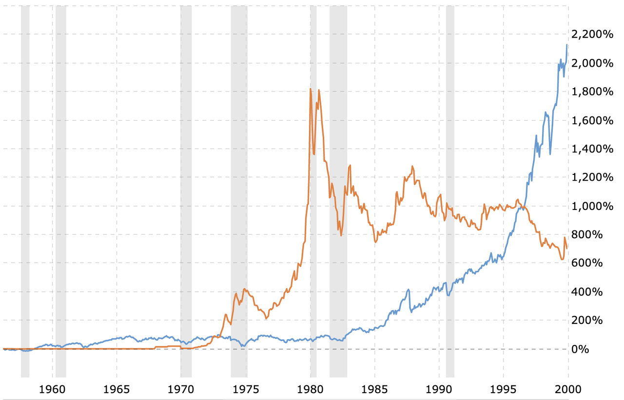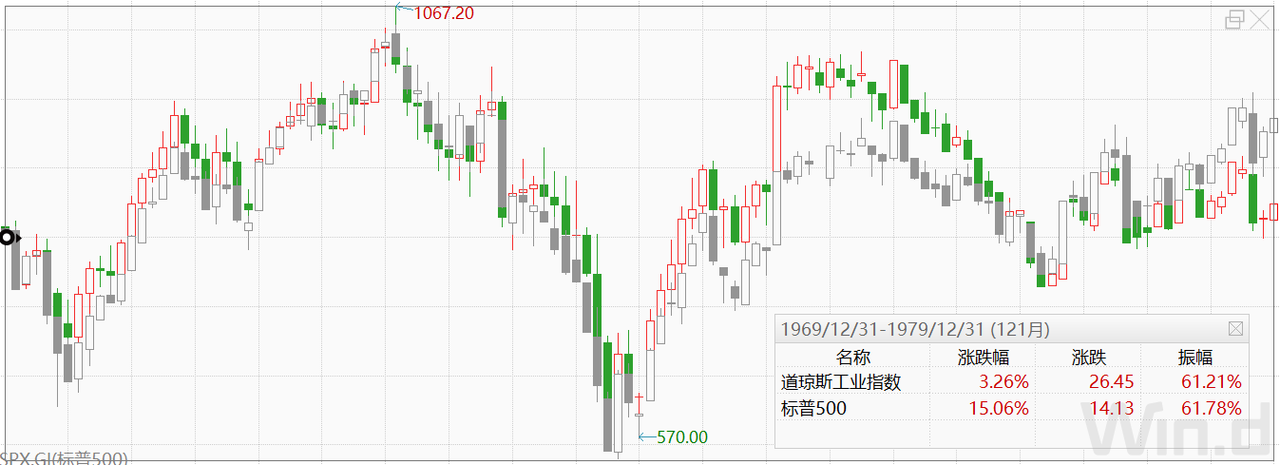 举个例子。如果我们回看历史,会发现美股市场在 1970 年代和 1980 年代的表现简直有天壤之别。在 1970 年代,美国经历了一系列的危机事件,比如越战升级、布雷顿森林体系瓦解、中东石油危机等等。而从 1969 年末到 1979 年末这整整十年时间,美国的道琼斯工业指数和标普500指数起起伏伏,十年下来几乎没怎么涨,如果算上通货膨胀甚至是亏损的。