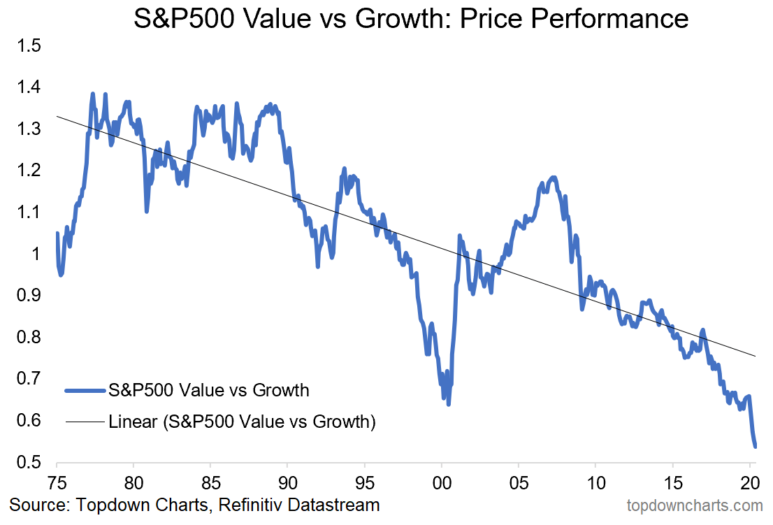 同样,在一个资产类别里,投资风格也可以轮动。比如从 2009~2020 年这段美股大牛市中,所谓的成长股表现非常出色,而价值股表现则非常凄惨,可以说惨到了历史最低水平。
