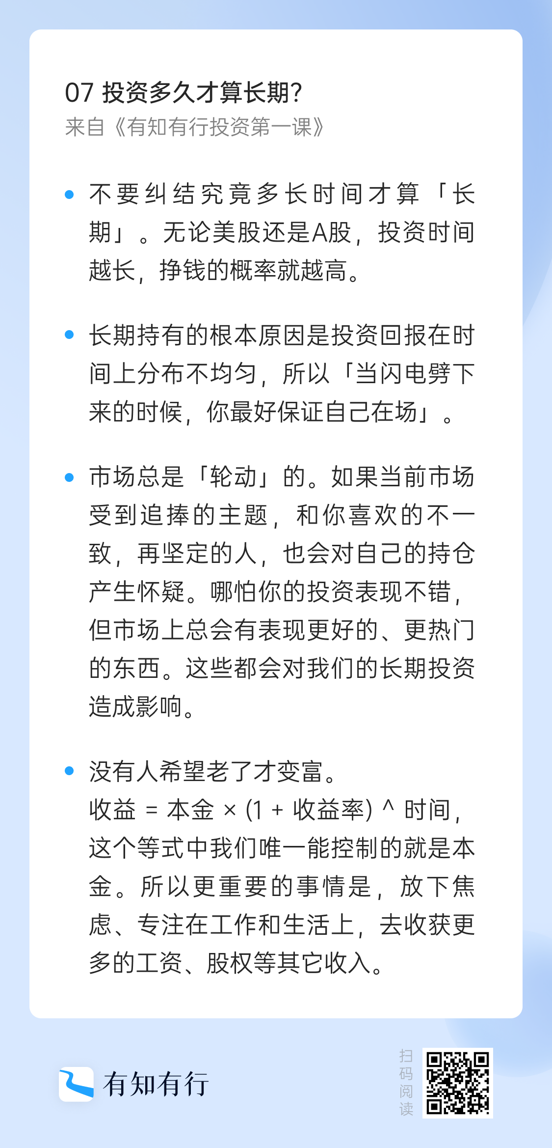 共读《投资第一课》 | 07. 投资多久才算长期? 3 年后第 3 遍读,我对「长期」的理解非常不同和清晰了:🌟长期并不是一个时间上的概念,而是一个关于周期的概念。🌟长期在我心里的意思是:足够长以致于足够覆盖一个低买高卖的大周期。 做一个有画面感的类比🌰,对大多数作物来说,「春播秋收」就是一个常见的播种周期,可同样是三个季度的时间长度,「冬播夏收」就比较罕见。重点不是时间,而是合适的周期。 在数据上,本课与「时间」有关的历史数据是:在美股,持有 20 年以上没有亏钱可能;在 A 股,持有 8.75 年以上不会亏。 而我想补充一个另类的数据来佐证:持有 6~7 年期的「回报效率」远低于持有 3~4 年,原因是A 股平均的周期为 4~5 年,持有 6~7 年时大概率是在第二个周期的底部区域(即 1.5 个周期),这个时候的年化收益率受第二个周期回落的影响而极大地拉低了整体收益率水平。 时间只是结果,周期才是原因。 在投资上,如果再想深一层,价格周期的背后又是估值周期、情绪周期、企业发展周期、经济和国运的周期。。。 一个真正的长期主义者,是感悟周期的投资者~当我们用周期的眼光去看: - 「无聊」的等待不再无聊,而成了「机遇」「蓄势」。 - 「轮动」的市场也不再难熬,我们能看见每一个资产类别、每一种投资风格的周期。 @和有知有行一起长大的第 1751 天
