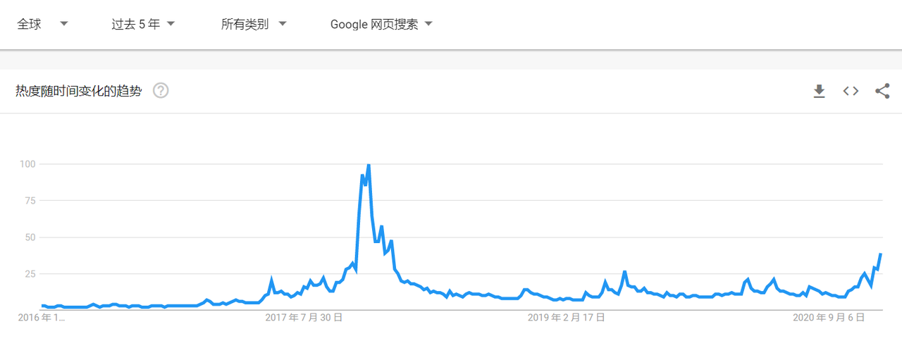 举个例子。很多老股民原来会数券商营业部门口的自行车,或者根据旁边人向自己打听股票人数的多少,来判断市场的火爆程度。搜索引擎也有类似的作用,比如在2017年末比特币大牛市的时候,谷歌上面「bitcoin」这个关键词就有大幅暴涨。