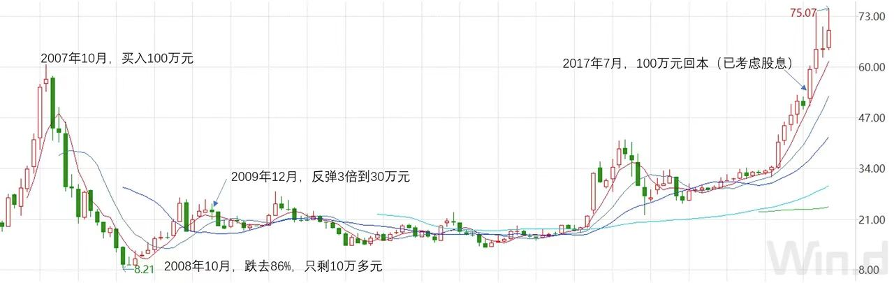 上面的这张图是平安股价的月线图,图中一根小柱子代表一个月的股价涨跌幅。现在回看这些,感觉就像在飞机上看大海,一片平静。可是如果你身在其中,每天都感觉是惊涛骇浪。