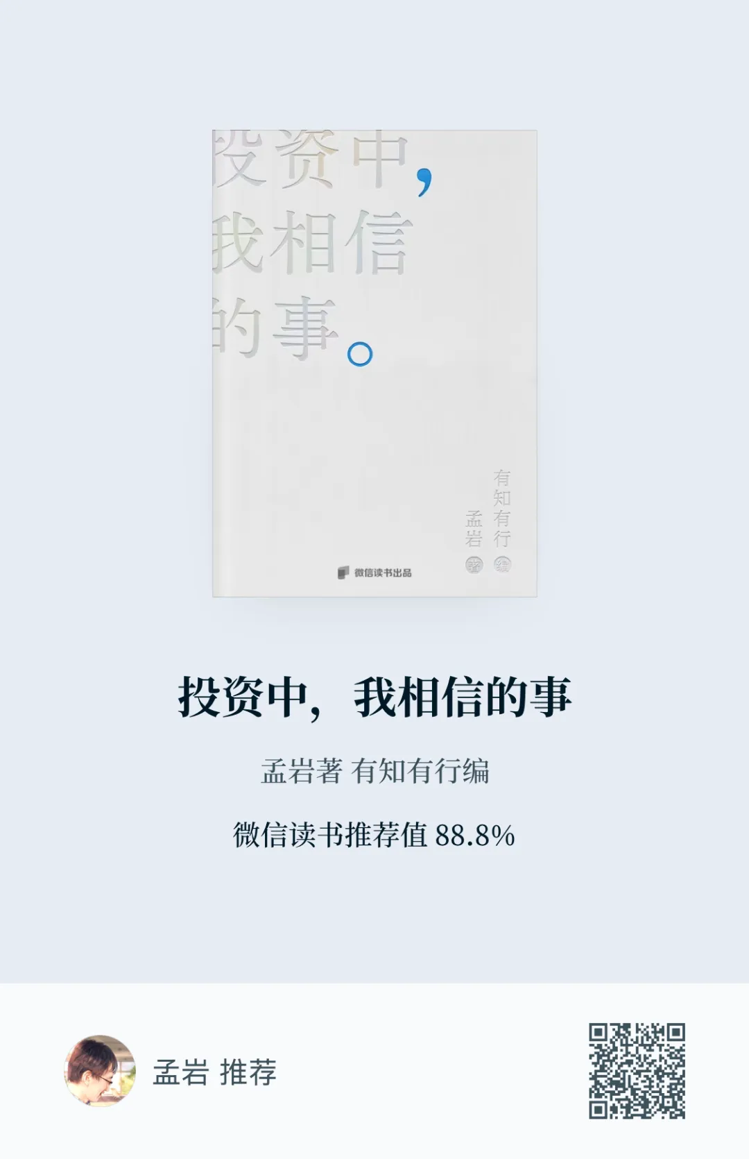 这本小册子叫做《投资中,我相信的事》,现在去微信读书,搜索「孟岩」或者「投资中,我相信的事」就可以看到啦。