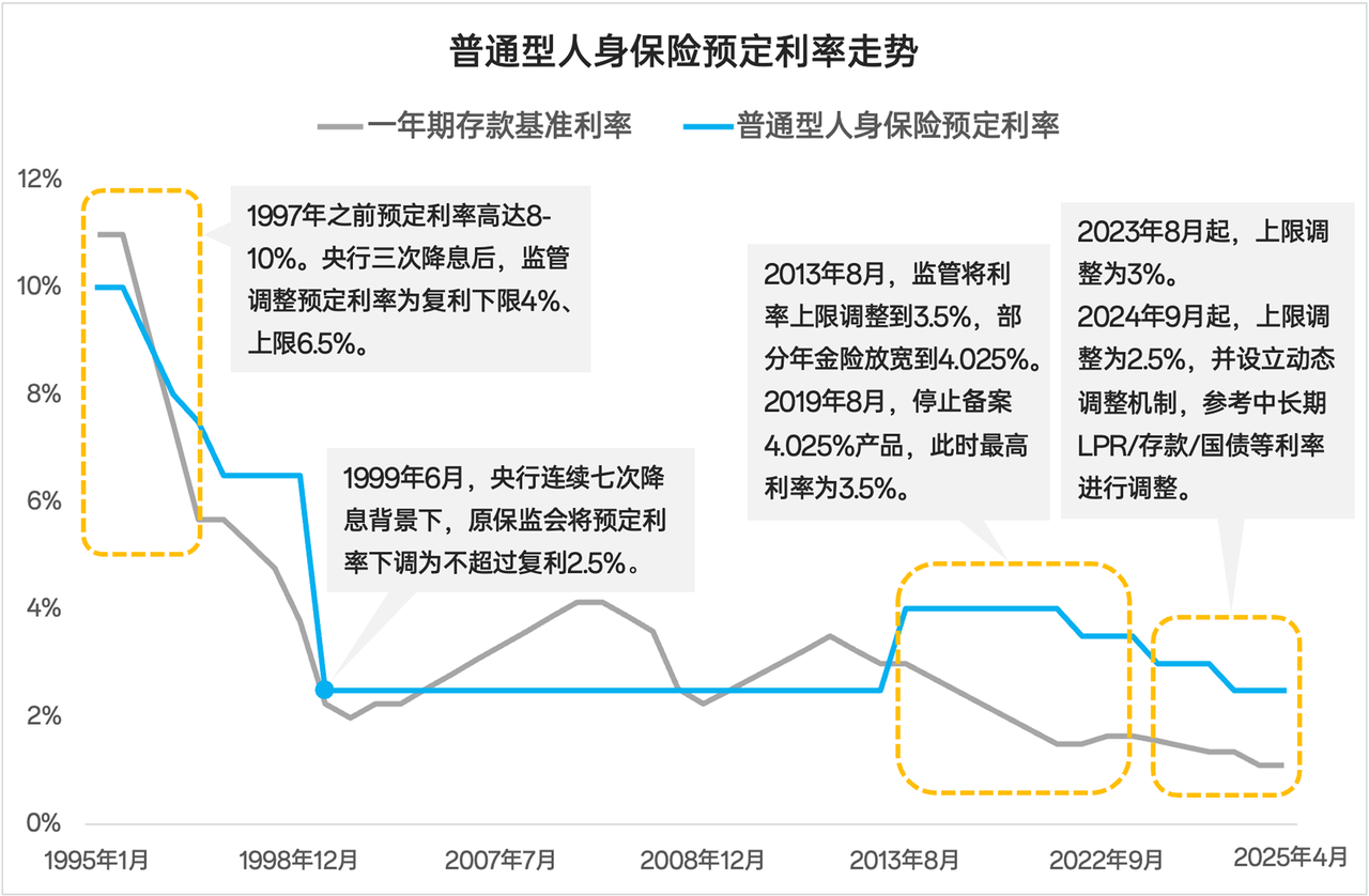 之前,预定利率调整是靠监管发文集中推进,时效上没那么及时,调整起来也更显得大动干戈。到了 2025 年 1 月,监管发布了《关于建立预定利率与市场利率挂钩及动态调整机制有关事项的通知》。简单理解,未来预定利率不是完全由「监管直接说调」,而是基于「市场参考利率」自动动态调整。