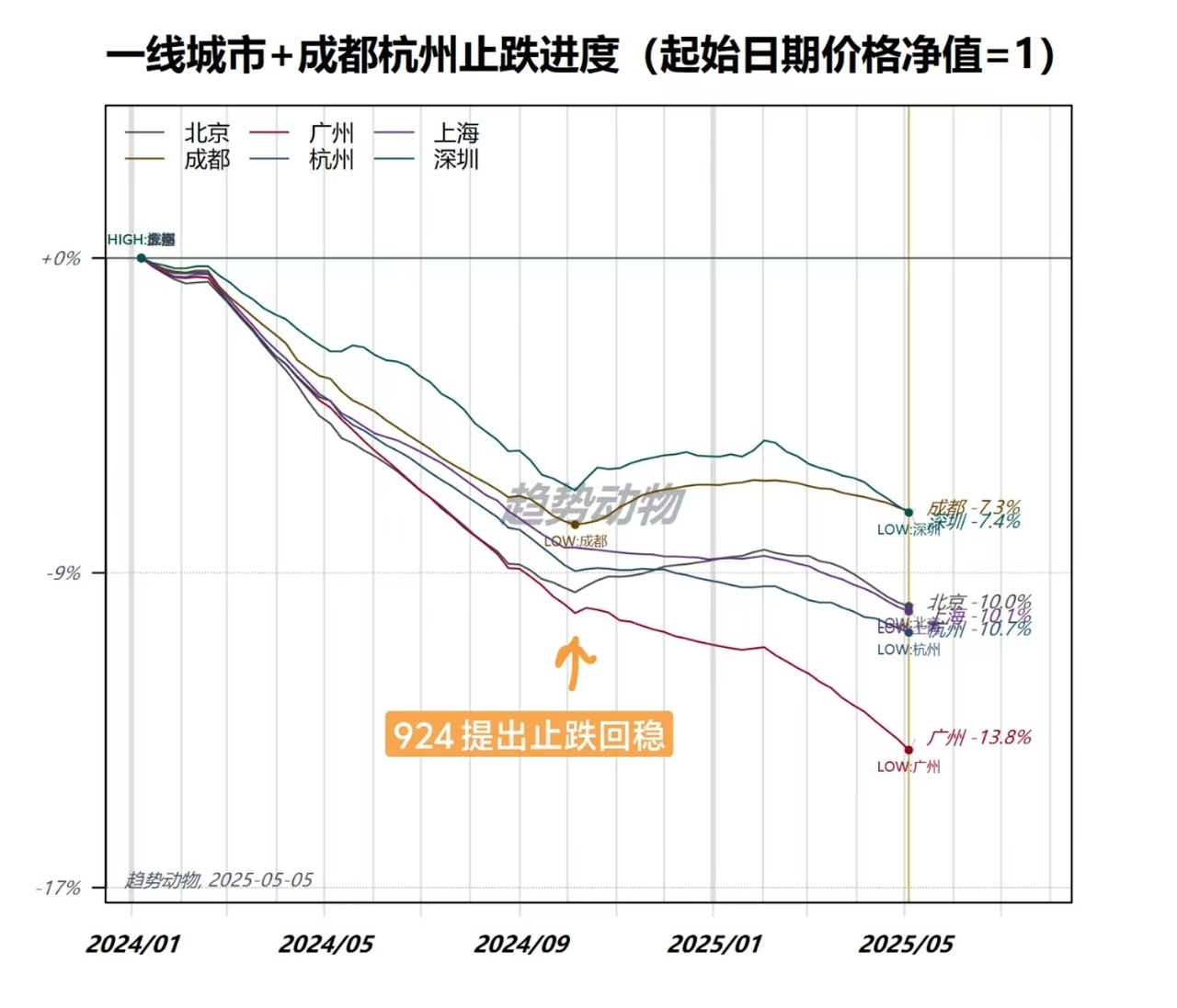 02:20 2024年 924 一揽子金融政策(旨在促进房地产市场止跌回稳)提出以来,重点城市房价走势(边际挂牌价口径)👇