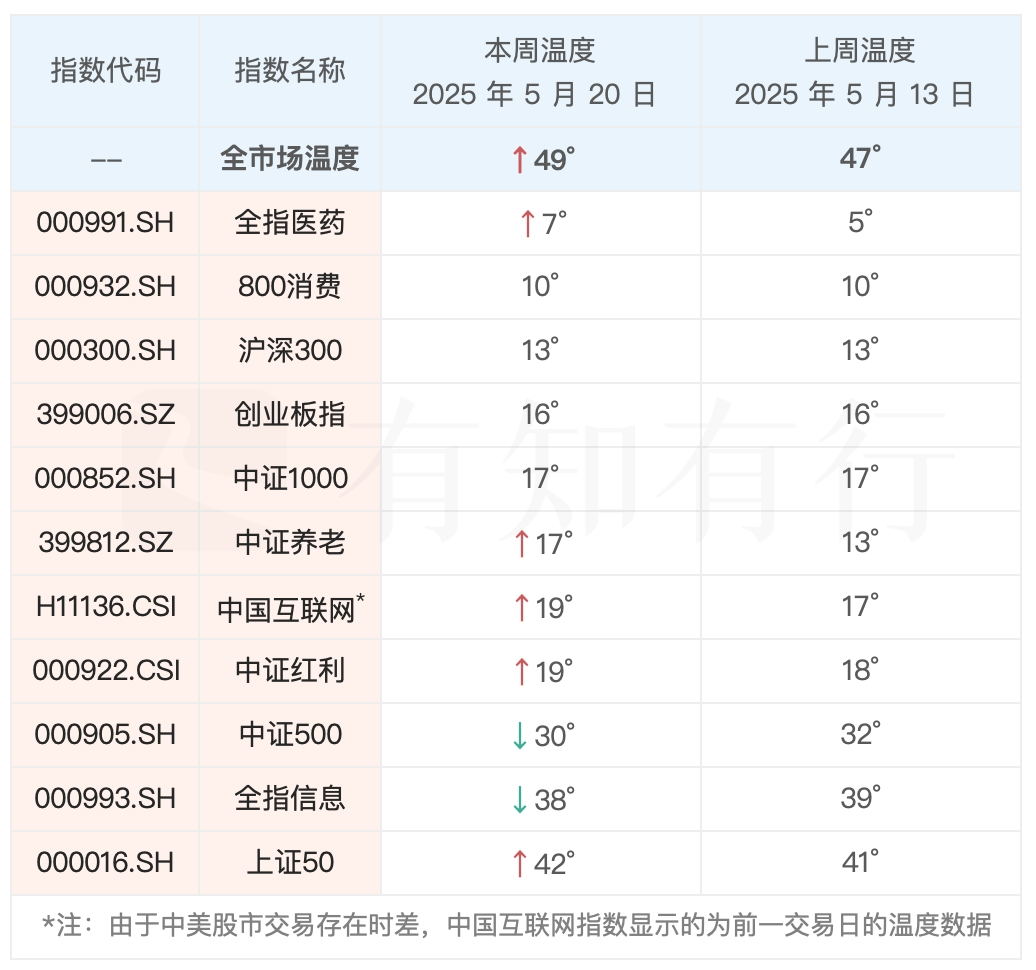 由于大多数小盘股、微盘股涨幅较好,受此影响,我们最新的全市场温度提高到 49°。