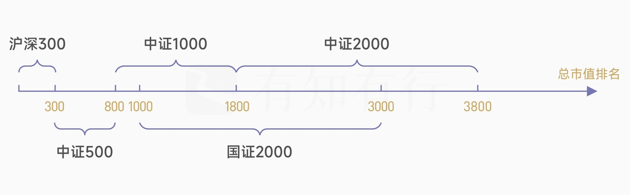 也就是说,按照成分股的市值规模从大到小排列,分别是沪深300、中证500、中证1000、中证2000。沪深300是大盘股指数,中证500是中盘股指数,中证1000是中小盘股指数,中证2000是小盘股指数。具体可以看下图了解它们之间的关系: