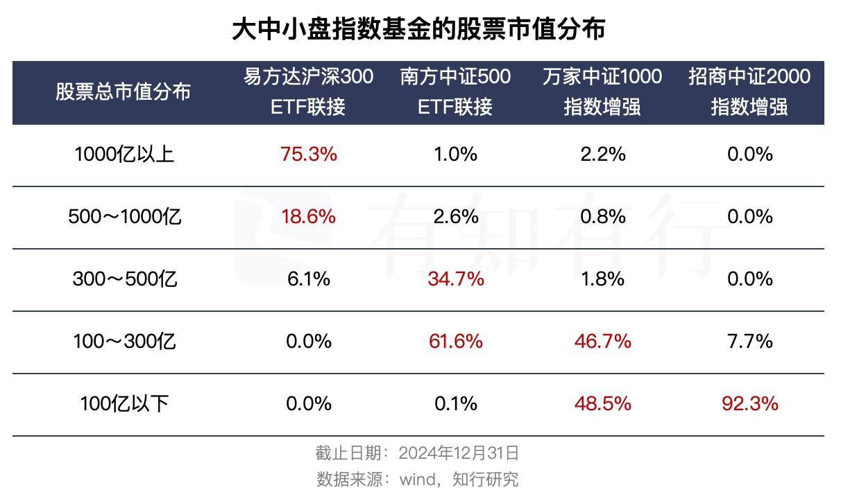 我们换个角度,从可投资的基金的视角来具体看看四个指数的区别。下图中展示了市场上规模较大的、具有代表性的、分别跟踪这四个指数的基金产品,在各自投资的股票市值上的分布情况。