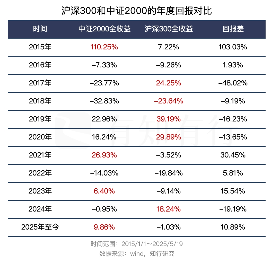 上图中我们展示了中证2000、沪深300指数从 2015 年开始到现在,每年的回报以及二者的回报差。考虑股票分红带来的影响,我们选择了全收益指数进行说明。