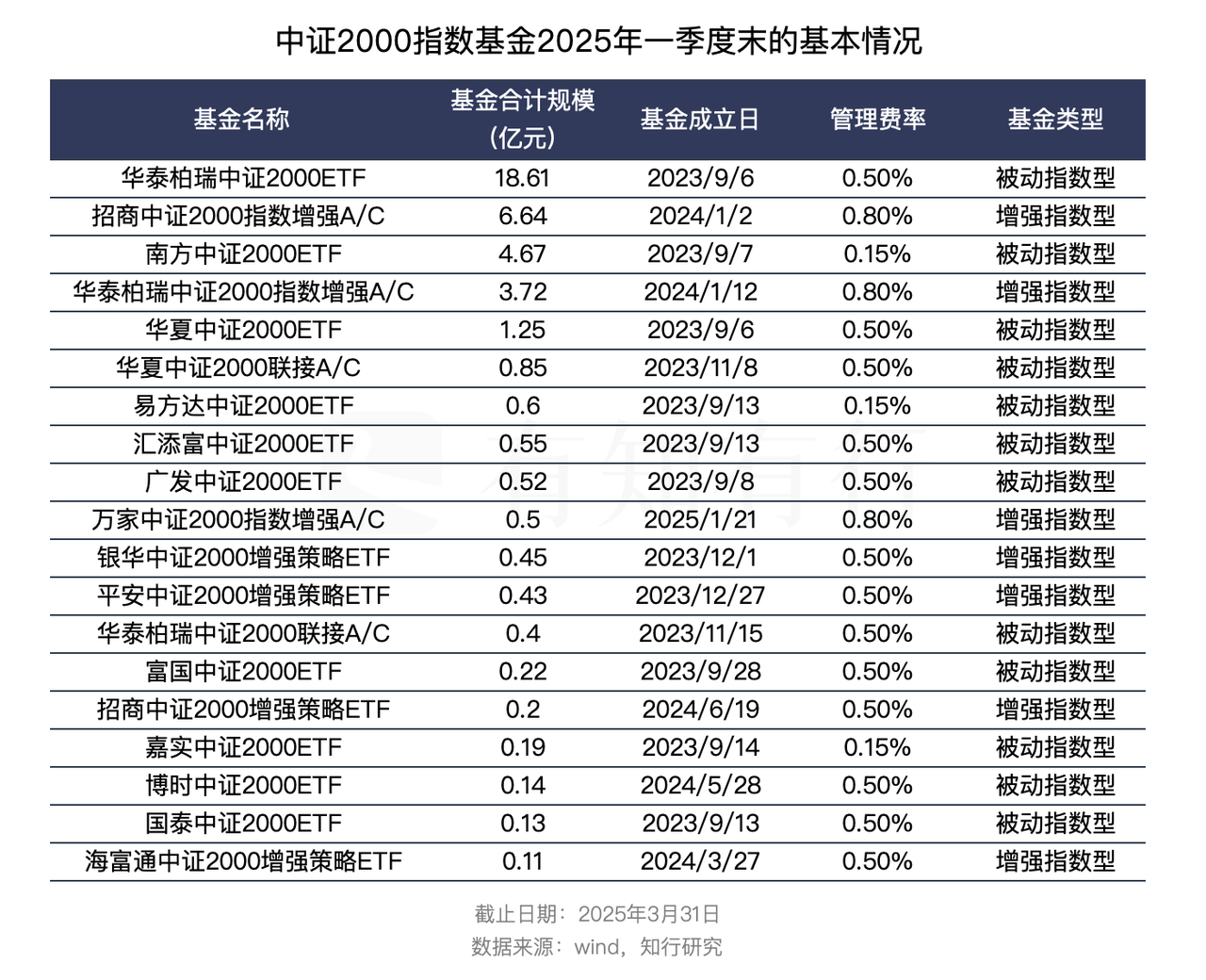 那么为什么长钱账户没有配置中证2000相关的基金,只配置了沪深300、中证500、中证1000指数基金呢?公募基金里,小盘股基金整体成立时间较晚,规模也较小。下面这张图是今年一季度末,市场上跟踪中证2000的指数基金的基本情况。