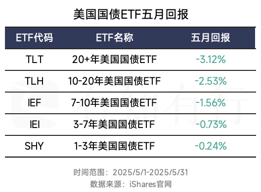 相比美股五月的强劲表现,美债则受到了一定冲击。美国十年期国债收益率从月初的 4.21% 一路走高,月中一度抬升至 4.60% 左右,月末回落到 4.40%。国债收益率的上升意味着国债价格的下跌,下图展示了不同久期的美国国债 ETF 的表现,可以发现各种久期的国债 ETF 都有不同程度的下跌,其中长债跌幅较大,短债跌幅较小。