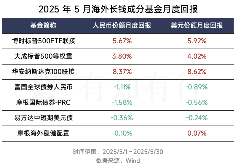 汇率方面,人民币在五月有一定程度的升值。离岸人民币汇率从 7.28 变动至 7.20,人民币汇率中间价从 7.20 变动至 7.18。人民币升值,意味着美元相对贬值,海外长钱持有的是以人民币计价的美元资产,月度表现会弱于同基金的美元份额,正如下图所示。