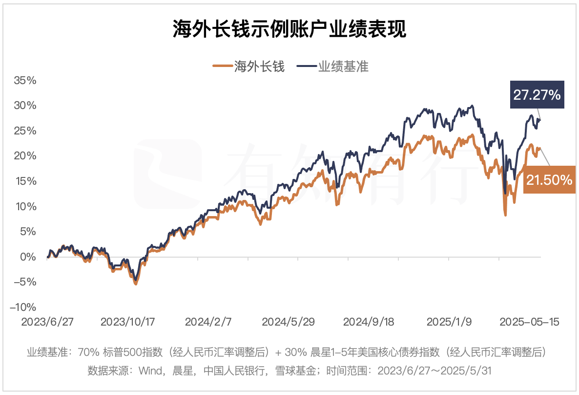 在过去两年里,海外长钱的股票部分,主要投向集中在美股。受益于此,海外长钱的业绩表现优异。截止 2025 年 5 月 30 日,海外长钱示例账户近两年累计业绩回报为 21.5%。