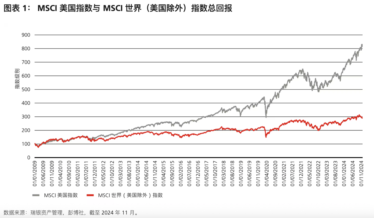 过去近 20 年,几乎是美股独占鳌头的时代。下图来自瑞银资产管理,展示了自 2009 年以来 MSCI 美国指数与 MSCI 世界(美国除外)指数的对比。若按美元计算,MSCI 美国指数每年的表现比 MSCI 世界(美国除外)指数高 4.5%。