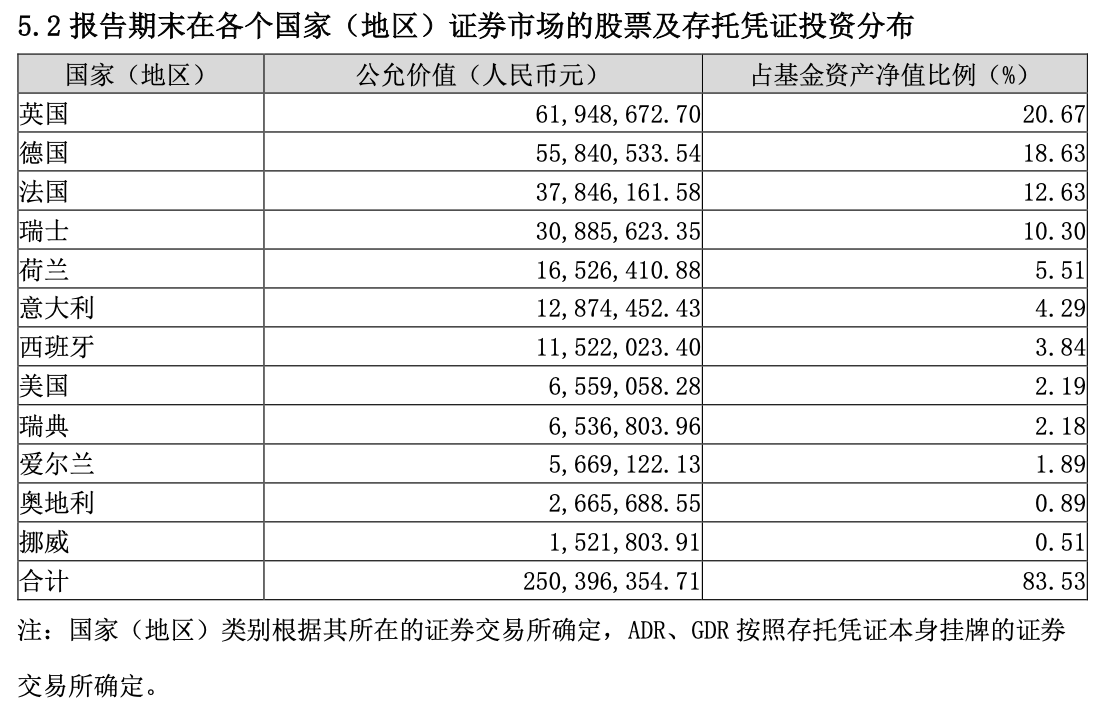 摩根欧洲动力策略在 MSCI 欧洲指数的基础上进行主动管理,优点是能在全欧洲市场选股。从下图(来自基金 2025 年一季报)的地域分布中也能发现,各国股票的持有比例与各国权益市场的规模类似,能较好地帮助我们覆盖全欧洲市场。当然,由于这是一只主动管理基金,管理费率为 1.2%,相对指数基金来说略高。