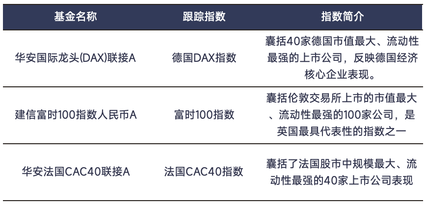 目前 QDII 基金几乎都在限额的状态下,摩根欧洲动力策略目前(2025 年 6 月 6 日)限额为单个交易日 5000 元。如果是持仓金额较大的用户,在这次调仓中会在买满主基金的情况下,买入该基金的备选基金,分别是华安国际龙头(DAX)联接A、建信富时100指数人民币A和华安法国CAC40联接A。这三只都是指数基金,投资单一股票市场,对应指数分别如下图所示。