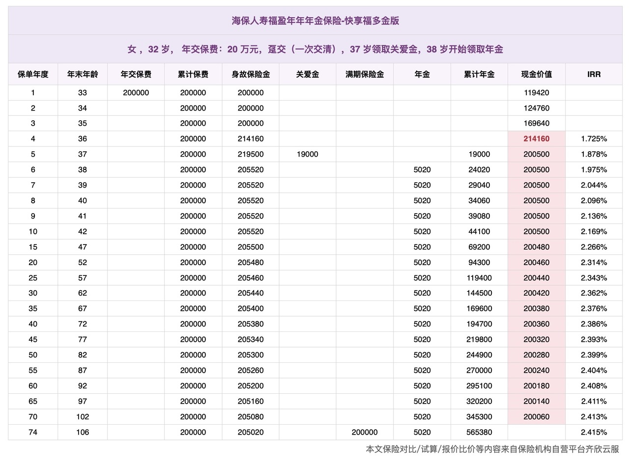 比如小童和太太,拿 20 万一次性投保目前的一款快返年金,快享福(多金版):