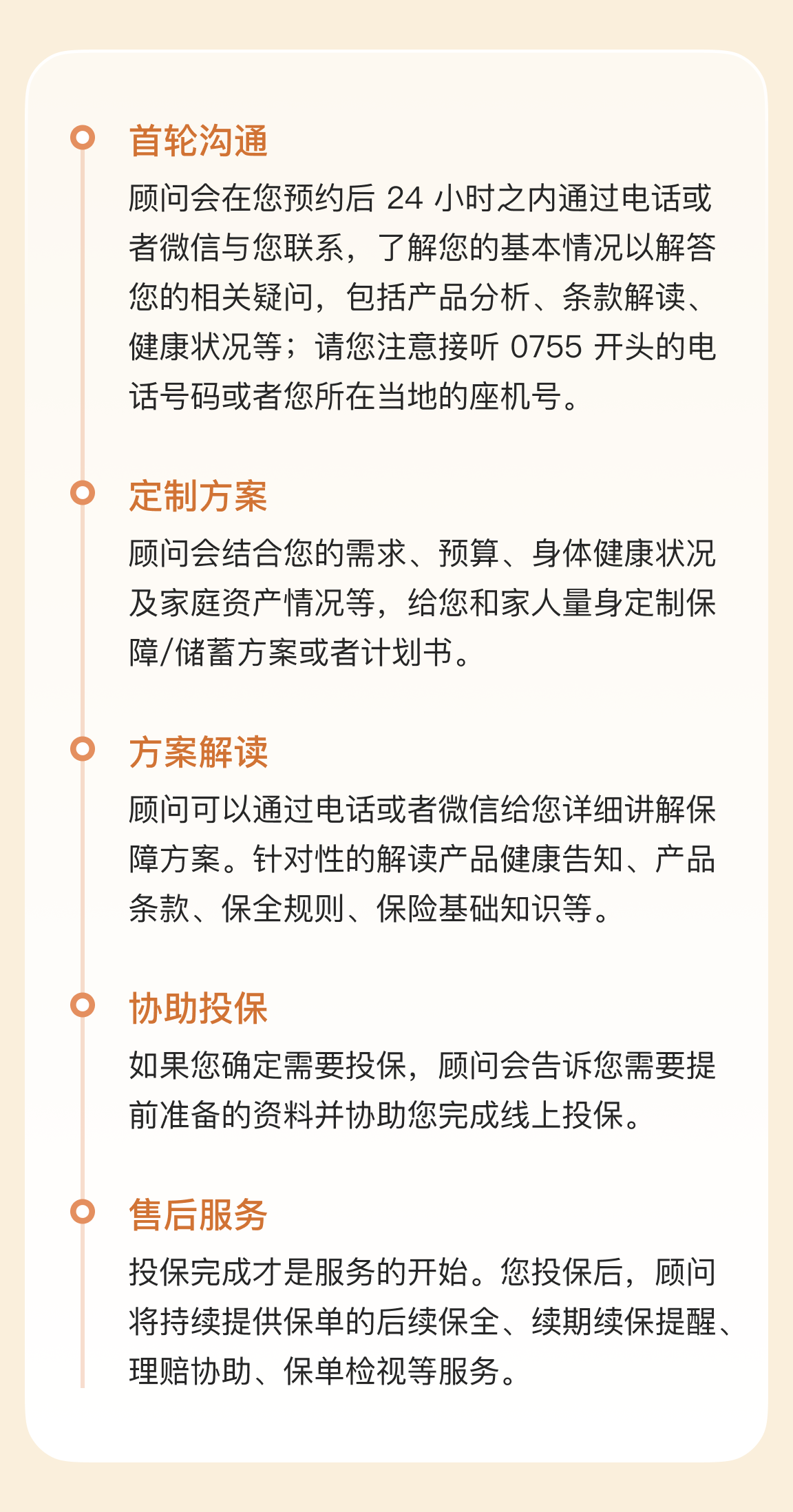 顾问会一步步帮你确认需求、匹配产品、填写健康告知,并指导后续投保流程。不论你已有明确方向,还是完全不知道从哪开始,他们都可以根据你的情况,协助你逐步完成。