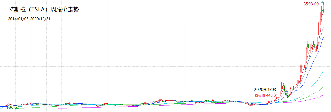 从 2014 年到 2019 年,整整 6 年的时间,特斯拉的股价其实没有太大的变化。而 2020 一年,特斯拉的股价就涨了 7 倍多。
