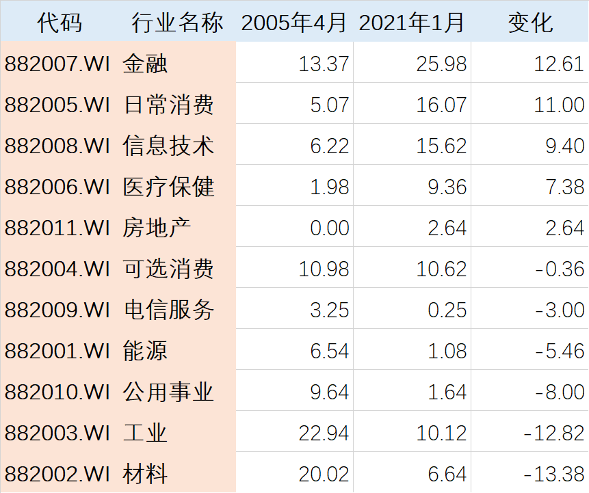 沪深300指数的行业构成来说,在近 20 年的时间里,各行业的占比产生了巨大的变化,比如「日常消费」行业的占比从 5% 提升到了 16%,「信息技术」从 6% 提升到了 15%,而「工业」、「材料」和「能源」行业的占比则下降了 12%、13% 和 5%。