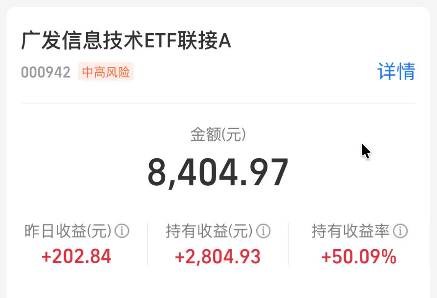 打开对应跟车交易的基金平台,比如支付宝。可以看到原 6300 元成本的基金,现在最新的市值是 8404.97 元。