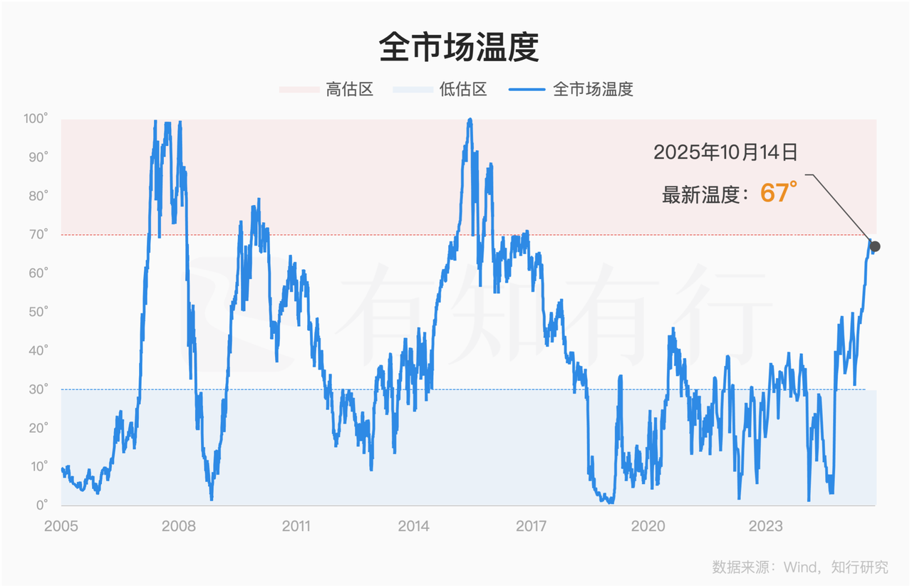 各位好久不见啊,因为国庆假期,黑板报专栏停更了两周,今天复更啦。先来看看股市的表现,从上一次黑板报文章发布时间 9 月 24 日开始,一直到 10 月 14 日,A股经历了节前上涨、节后回调的行情。从全市场来看,中证全指变化不大,最新的全市场温度是 67°。