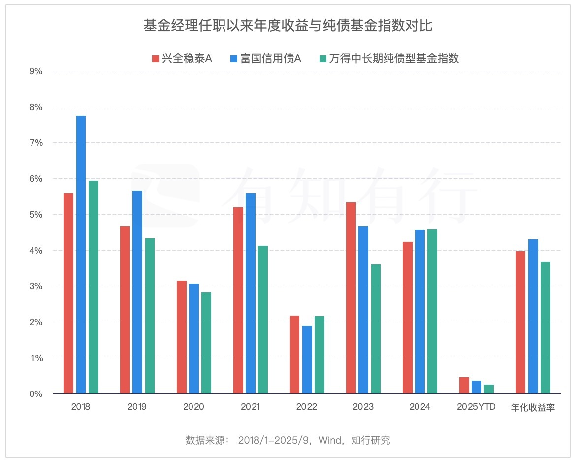 我们以基金严选中的兴全稳泰A和富国信用债A为例,它们的久期都在 3 年左右,长期的投资风格保持稳定。从基金经理 2018 年初任职管理至今,在每一年它们的业绩,相比行业平均水平都相差不大,从单年度来看表现并不算很突出。从长期的年化收益来看,它们的收益率也仅仅比中长期纯债基金指数分别高了 0.27% 和 0.63%。