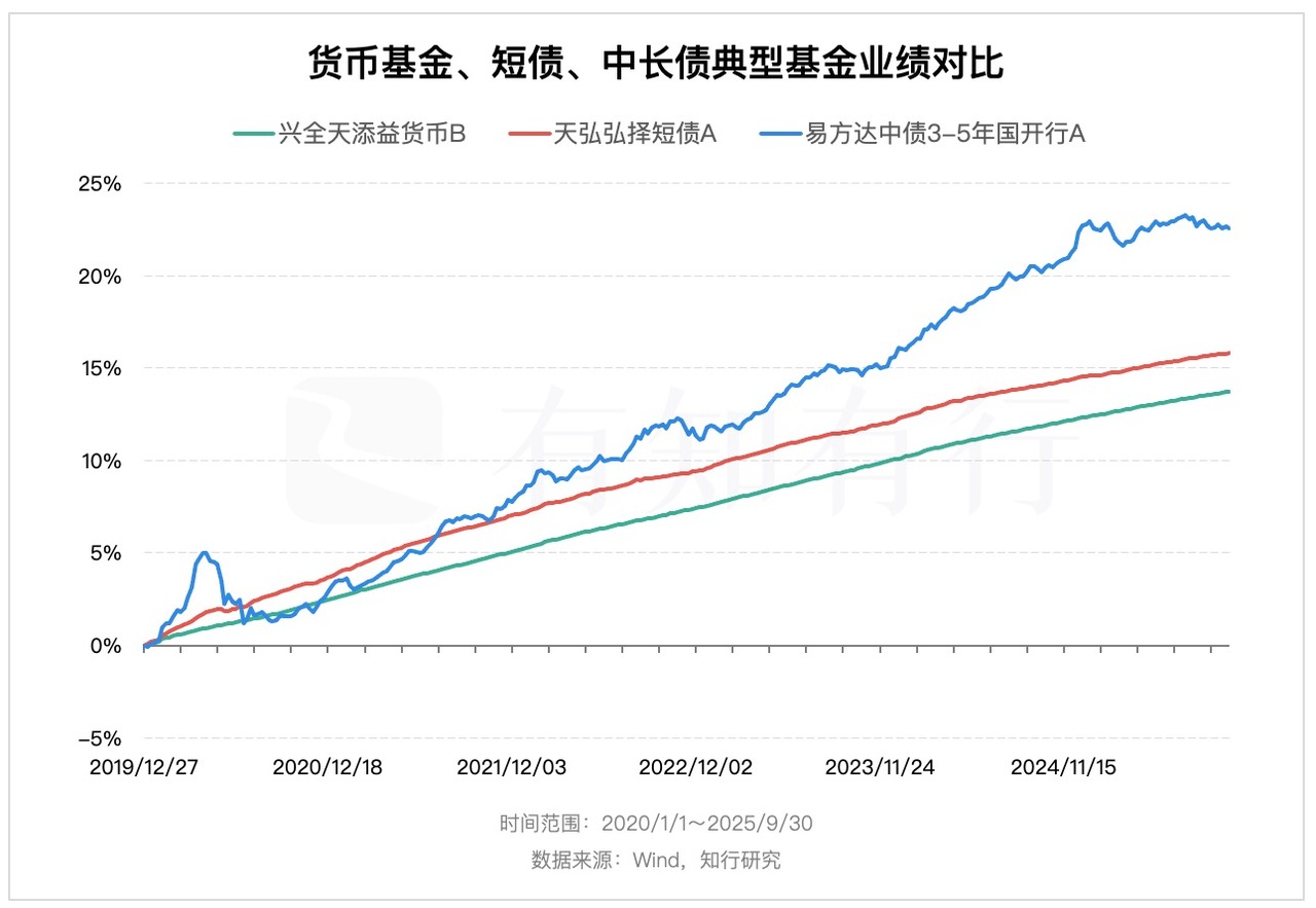 我们把基金严选中的货币基金、短债基金、中长债基金各拿出一只基金来进行业绩对比,就可以清晰看到它们之间的收益和风险特征区别:
