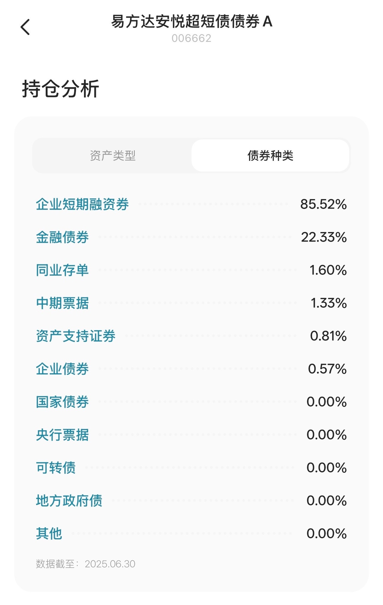 所以为了弥补指数基金覆盖的不足,我们还纳入了主动基金。主动基金的特点是它可以同时配置利率债和信用债,基金经理会根据自己的投研观点进行分配。我们可以在每一只具体基金页面的持仓分析部分,看到它的债券种类分布,比如易方达安悦超短债债券A,它主要配置的债券类型是企业短期融资券,属于信用债。