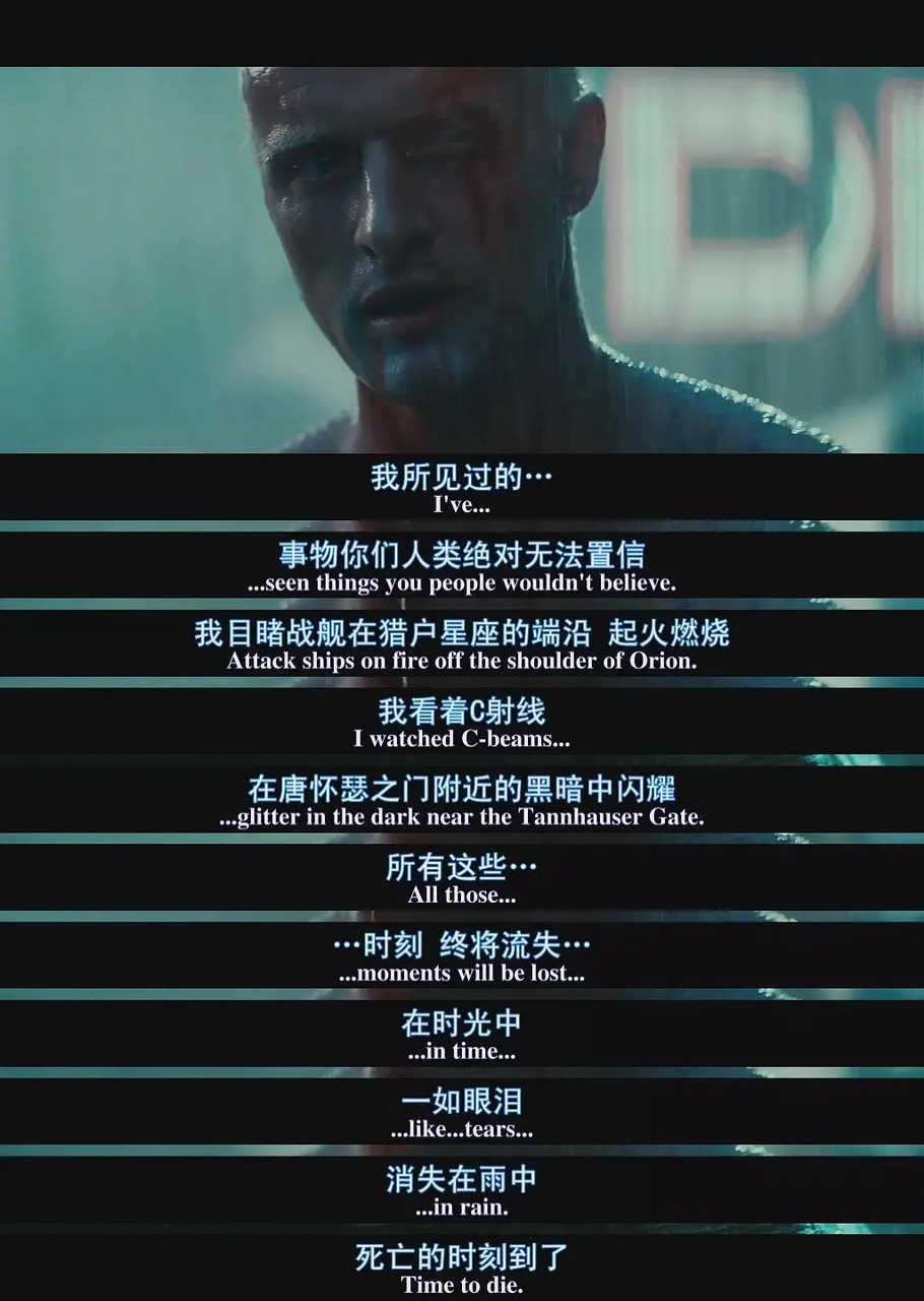85:00 电影:《银翼杀手》(1982),改编自菲利普·迪克的小说《仿生人会梦见电子羊吗?》 ,片中的仿生人死前独白如下——