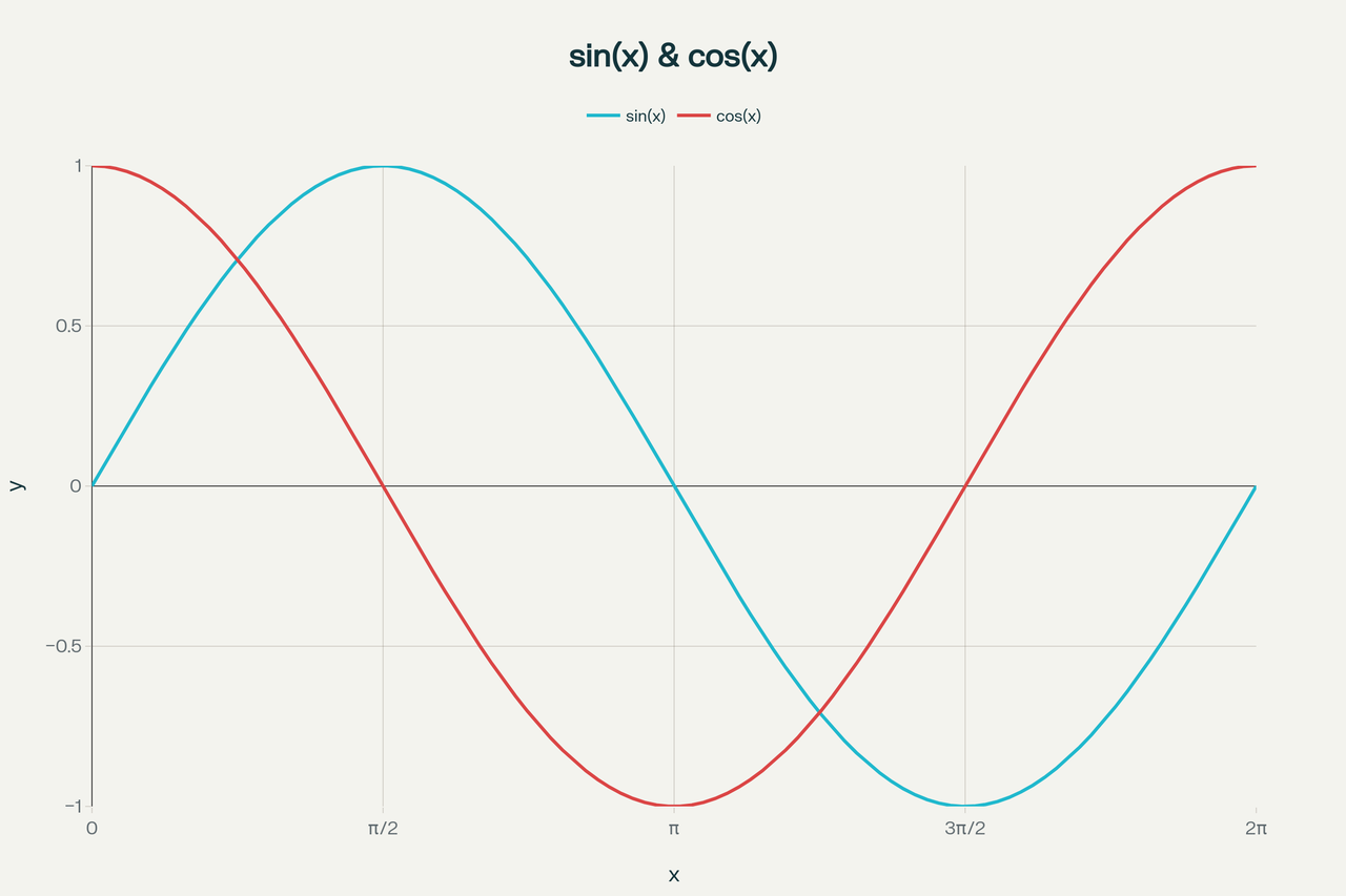 54:24 正弦波 / 余弦波:一种周期性上下波动的数学曲线,两者波形本质一样,唯一差别是相位差 90 度(π/2)。一个达到峰值的同时,另一个正好通过零点。