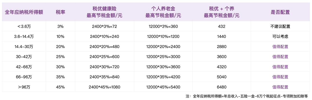 以 20% 税率档为例,充分利用税优健康险和个人养老金政策,一年最多能节省 2880 税款。有个博主将这个节税效果类比为「你得把28万存入货币基金,放一年,才能赚到这么多」。