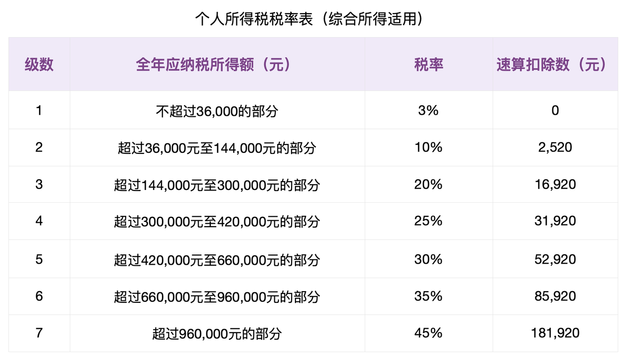 其中,适用税率和速算扣除数是国家统一规定的,关键是计算出你的「应纳税所得额」,然后就能查到对应的税率档次了。