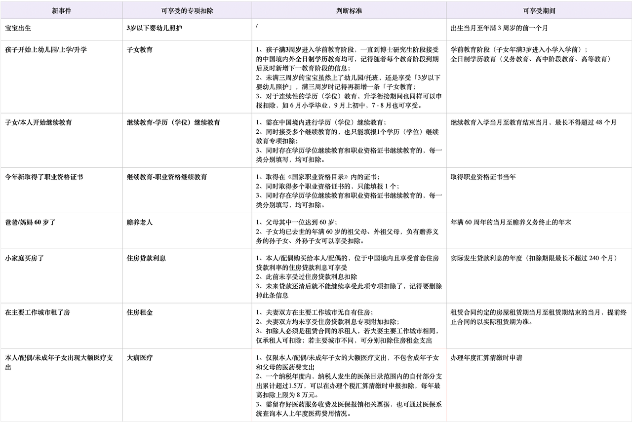 专项附加扣除与我们生活息息相关,涉及赡养老人、房贷房租、子女教育、大病医疗等方面。如果生活发生变化,对应的扣除信息也需要及时更新。